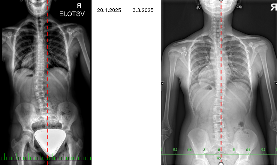 RTG snímky po 8 měsících cvičení u 15 leté dívky – bohužel s pauzami, přesto viditelné zlepšení křivky.