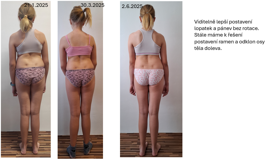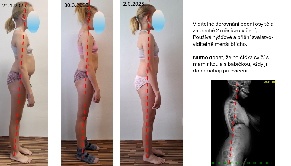 Zlepšení za 6 týdnů u 12 leté dívky – cvičí doma 1h denně k tomu provádějí modelační asymetrické masáže (každou stranu těla dítěte masírujeme jinak, proto masírujeme děti na boku- tento postup je u každého dítěte jiný, dle jejich RTG snímků).